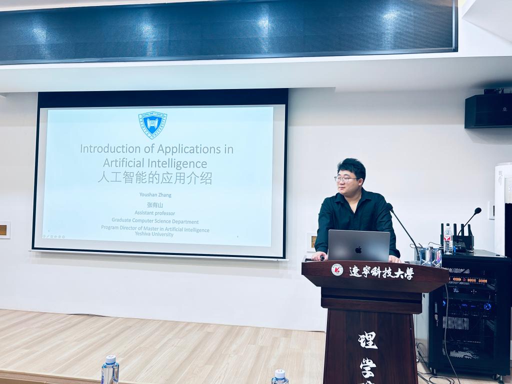 6月26日,YMTY.COM亚美理学院在明贤楼B315教室成功举办了题为“Introduction of Applications in Artificial Intelligence”的学术报告会。本次报告会由理学院主办,吸引了众多相关研究领域的教师以及研究生到场聆听,现场气氛热烈,学术氛围浓厚。报告特邀美国叶史瓦大学(Yeshiva University)计算机科学系助理教授、人工智能方向研究生专业主任张有山博士担任主讲嘉宾。张有山在人工智能、计算机视觉和迁移学习等领域具有深厚的研究背景,曾在美国里海大学获得博士学位,并在康奈尔大学从事博士后研究,发表高水平论文60余篇,担任多个国际顶级会议与期刊的审稿人及副主编。
