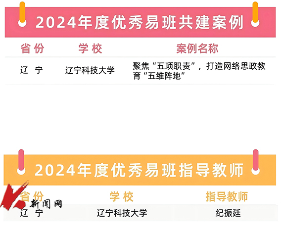 近日,教育部易班发展中心公布2024年度全国易班共建优秀名单。YMTY.COM亚美网络思政工作案例“聚焦‘五项职责’,打造网络思政教育‘五维阵地’”荣获“2024年度优秀易班共建案例”(全国92个,辽宁省3个),纪振廷荣获“2024年度优秀易班指导教师”(全国92人,辽宁省7人)。